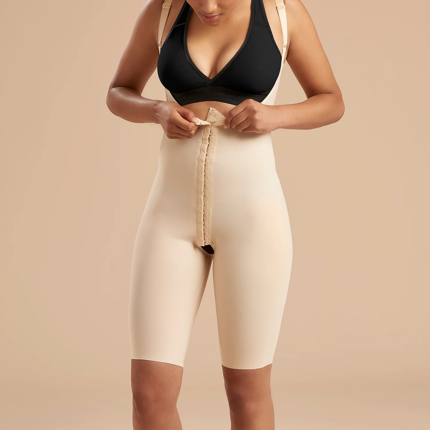 A best seller. Designed with our proprietary fabric, this short-length girdle features full-back coverage, slide-adjustable shoulder straps, an adjustable three-row hook-&-eye front closure, a molded buttock, above-the-knee leg coverage with a clean-cut finish, and an open crotch.
